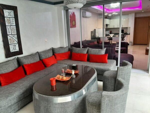 À louer, bel appartement moderne et entièrement meublé, situé à Aourir – Agadir, dans une résidence calme et sécurisée, à quelques pas de la plage.