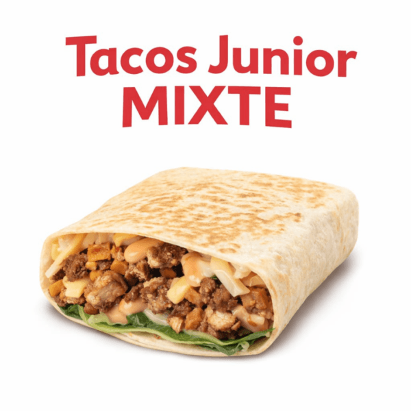 Goûtez à notre Tacos Junior Mixte, un format pratique et délicieux pour les petites faims. Chaque tacos est préparé à la minute avec un mélange de garnitures savoureuses comme viande hachée, nuggets, escalope ou saucisse, enveloppées dans une tortilla chaude et moelleuse, pour un encas gourmand et équilibré.