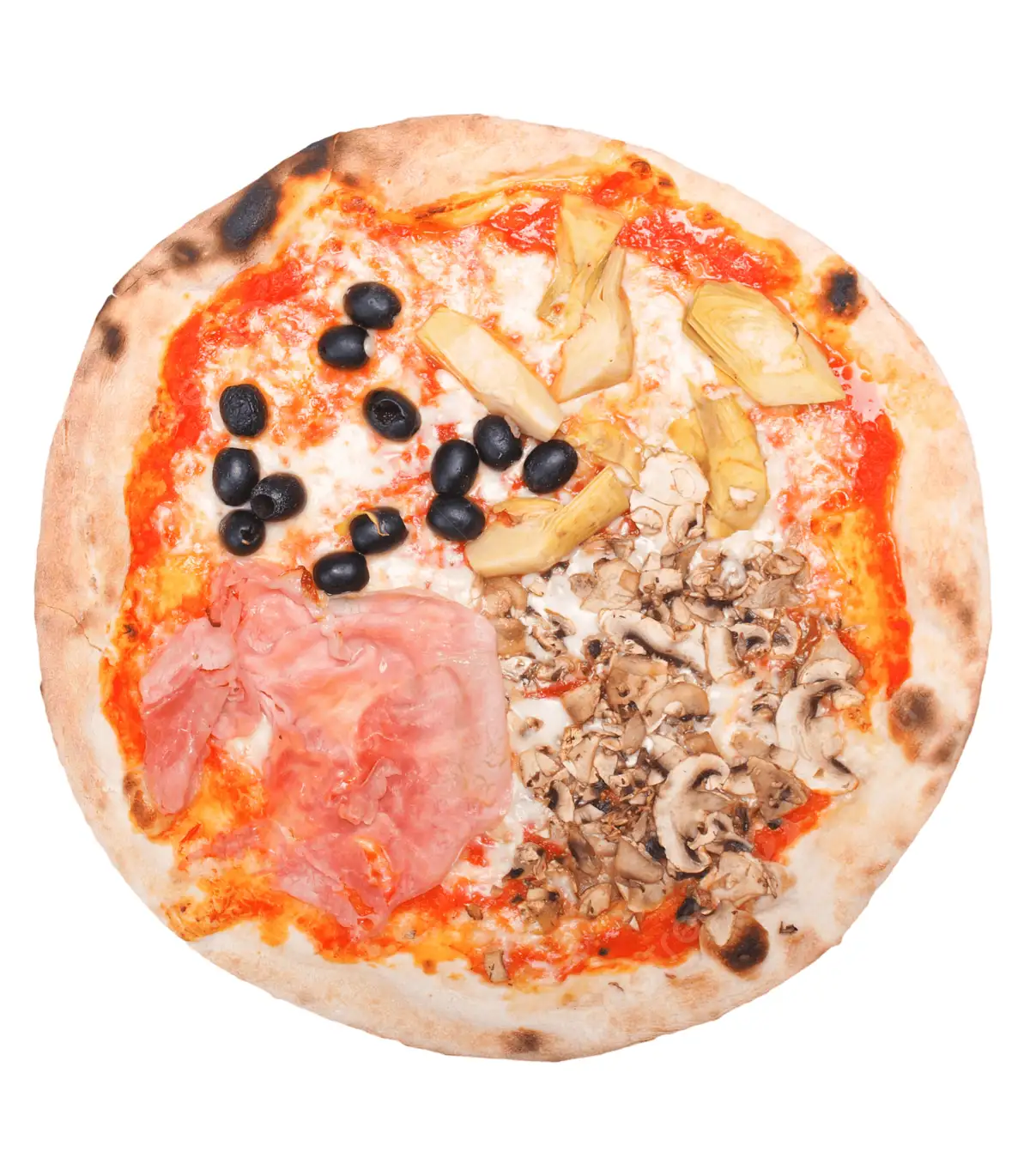 Savourez notre Pizza 4 Saisons, une pizza emblématique qui réunit quatre garnitures incontournables sur une pâte fine cuite au four, nappée de sauce tomate et fromage fondant.