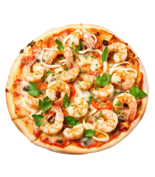 Découvrez notre Pizza Fruits de Mer, une pizza gourmande et raffinée, garnie généreusement de crevettes savoureuses et de fruits de mer sélectionnés, sur une pâte fine et croustillante, nappée de sauce tomate et de fromage fondant.