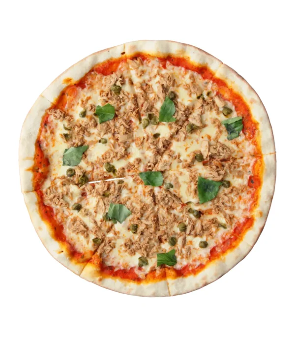 La Pizza Thon est une pizza savoureuse et équilibrée, garnie de thon émietté, de fromage fondant, de sauce tomate parfumée et de câpres, le tout sur une pâte fine et croustillante.