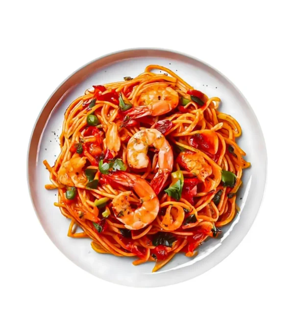Des pâtes spaghetti al dente, nappées d’une sauce tomate savoureuse, accompagnées de crevettes tendres et de fruits de mer sélectionnés, le tout relevé par des herbes fraîches et une touche méditerranéenne.