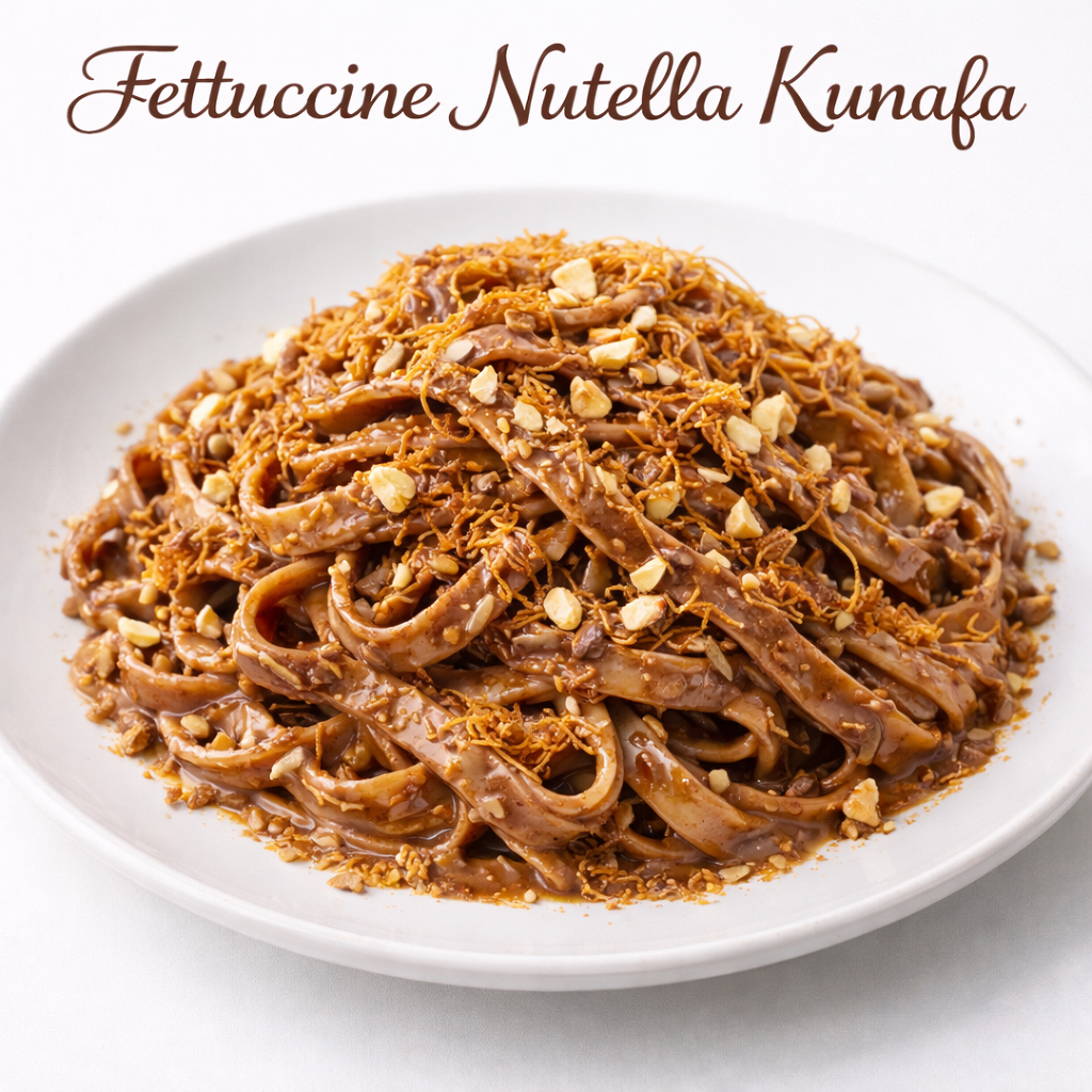 Découvrez nos Fettuccine Nutella Kunafa, un dessert gourmand qui marie fondant et croquant pour une expérience sucrée unique. Chaque portion est préparée à la minute avec des fettuccine chaudes et tendres, nappées de Nutella onctueux, et garnies de kunafa croustillante pour une texture irrésistible.