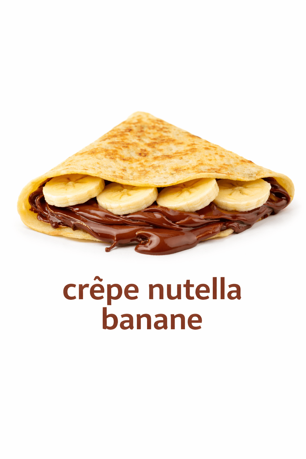 Découvrez notre Crêpe Nutella Banane, une crêpe ultra-gourmande préparée avec une pâte légère et moelleuse, généreusement nappée de Nutella fondant, puis garnie de bananes fraîches soigneusement tranchées.