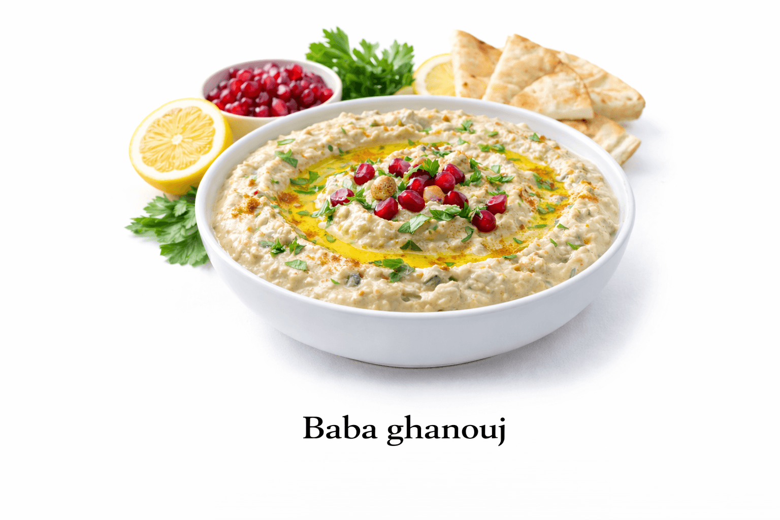 Découvrez notre Baba Ghanouj, une spécialité libanaise incontournable préparée à base d’aubergines grillées au feu, finement écrasées et mélangées à du tahini crémeux, du jus de citron frais, de l’ail délicatement dosé et un filet d’huile d’olive.