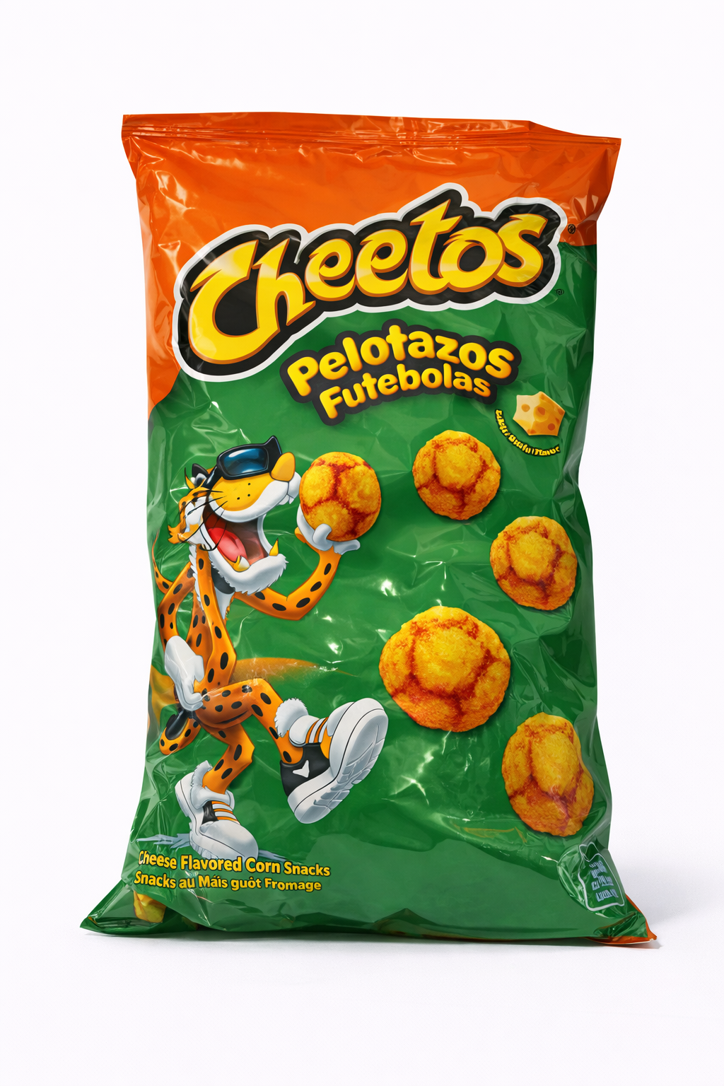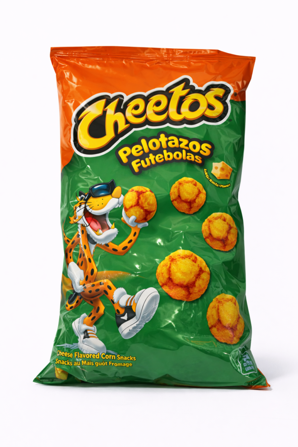 Découvrez Cheetos Pelotazos Futébolas, de délicieux snacks au maïs croustillants à la saveur fromage intense. Leur forme originale de petites balles et leur texture légère offrent une expérience fun et gourmande à chaque bouchée.