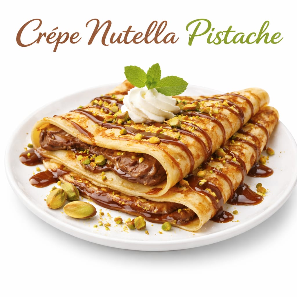 Savourez notre Crêpe Nutella et Crème Pistache, un dessert gourmand où la douceur du Nutella rencontre la richesse onctueuse de la crème de pistache. Chaque crêpe est préparée à la minute pour une texture fondante et légère, idéale pour une pause sucrée ou un dessert raffiné.