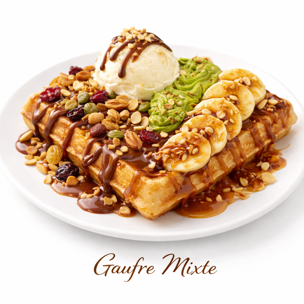 Découvrez notre Gaufre Mixte, un dessert gourmand qui combine plusieurs saveurs pour un plaisir sucré unique. Préparée à la minute, chaque gaufre offre une texture croustillante à l’extérieur et moelleuse à l’intérieur et une expérience gustative riche grâce à sa garniture généreuse et variée.