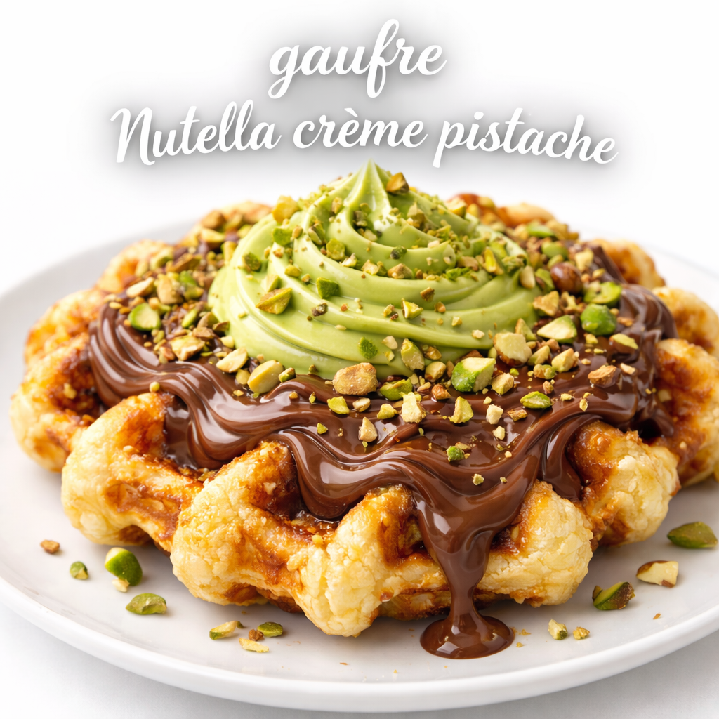 Savourez notre Gaufre Nutella et Crème Pistache, une création gourmande et raffinée qui associe la gaufre croustillante et moelleuse, le Nutella fondant et l’onctuosité de la crème de pistache. Préparée à la minute, cette gaufre offre un parfait équilibre entre douceur chocolatée et saveur délicate de pistache.