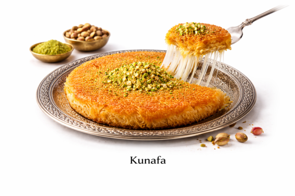 Une kunafa orientale traditionnelle préparée avec des cheveux de pâte croustillants, généreusement garnie de fromage fondant, puis délicatement imbibée d’un sirop parfumé à la fleur d’oranger.
