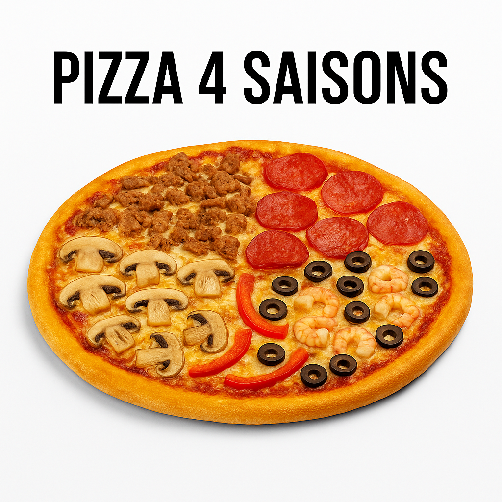 Découvrez notre Pizza 4 Saisons, une pizza classique et généreuse, appréciée pour la diversité de ses ingrédients et son équilibre parfait de saveurs.