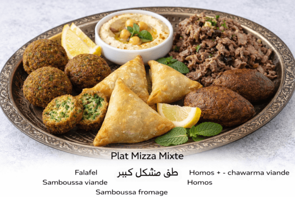 Découvrez notre Plat Mezze Mixte, un assortiment généreux et savoureux réunissant les meilleures spécialités libanaises chaudes, idéal pour les amateurs de cuisine orientale riche et conviviale.
