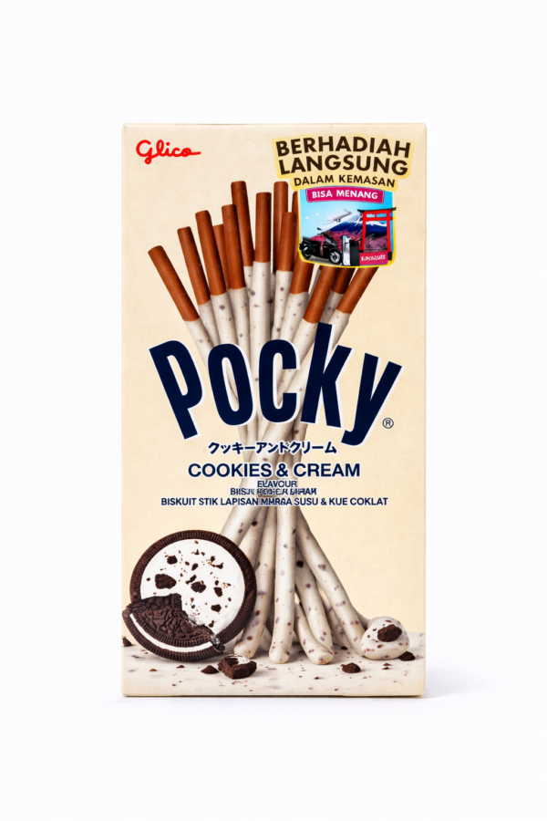Savourez Pocky Cookies & Cream de Glico, de délicieux bâtonnets croustillants enrobés d’un chocolat blanc onctueux aux éclats de cookies.