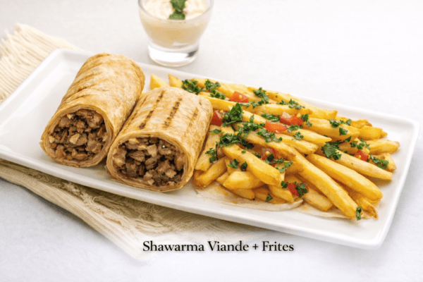 Délicieux sandwich chawarma à la viande, préparé avec de fines tranches de viande marinée aux épices orientales, lentement grillée pour une texture tendre et juteuse. Servi dans un pain libanais chaud, accompagné de frites croustillantes et d’une sauce maison au choix (tahina ou toumia).