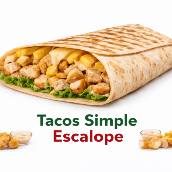 Découvrez notre Tacos Simple Escalope, préparé avec une escalope panée croustillante, des frites fondantes, une sauce fromagère onctueuse et des sauces au choix, le tout enveloppé dans une tortilla grillée et croustillante.
